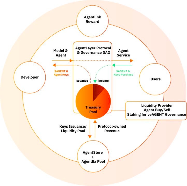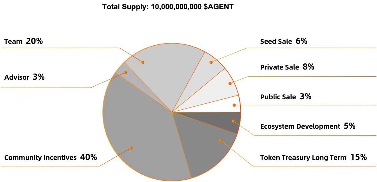 The economic model of AgentLayer is structured around $AGENT tokens, serving as the primary transaction medium and reward system within the network. These tokens play a crucial role in incentivizing participants like agent developers, model developers, node operators, investors and end users to collectively uphold the network ecology. Various economic activities within the network, such as agent service fees, node rewards, protocol revenue, and AI assets’ minting, deployment and transactions, are settled in $AGENT tokens. This mechanism ensures the circulation of value and ecological balance within the AgentLayer network.