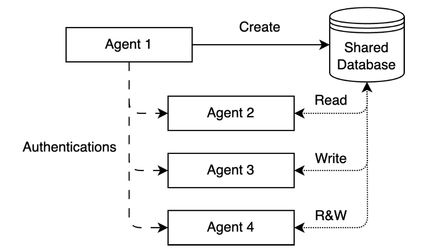 Each Agent has the capability to establish a shared knowledge database for storing information that requires sharing, with authorized Agents having access to this shared knowledge database. Different Agents can possess varying read and write permissions within the shared knowledge database, ensuring controlled access and collaboration among Agents.