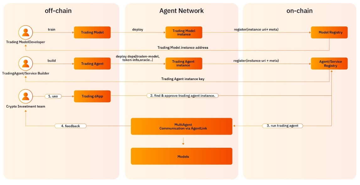 The AgentOS layer establishes integration between off-chain services and on-chain operations, enabling Agents within the AgentOS Layer to function in a distributed and decentralized manner. It achieves this by anchoring off-chain services, Agents, and Large Language Models (LLMs) to on-chain protocols, creating a contractual framework for the creation, operation, and protection of on-chain service ownership and rights confirmation.