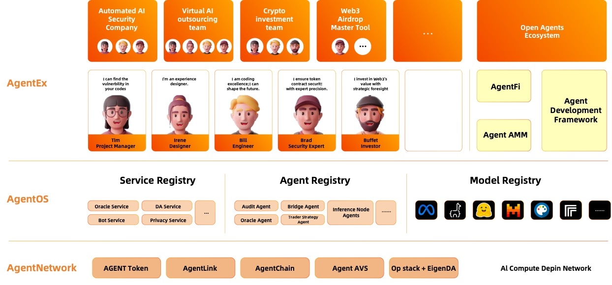 AgentLayer utilizes the OP Stack and EigenDA to create AgentChain, a public blockchain that enhances coordination and collaboration among Agents powered by the AgentLink protocol. This blockchain facilitates contracts and trading logs between Agents, offering an Agent OP Sequencer to enhance the collaborative network of Agents. Through innovative protocols like AgentLink, AgentLayer enables multi-agent collaboration by facilitating communication, task completion, and incentive sharing among Agents. This approach not only boosts individual AI agent capabilities but also enhances collective efficiency in addressing diverse challenges, laying a strong foundation for a future driven by AI agents.
